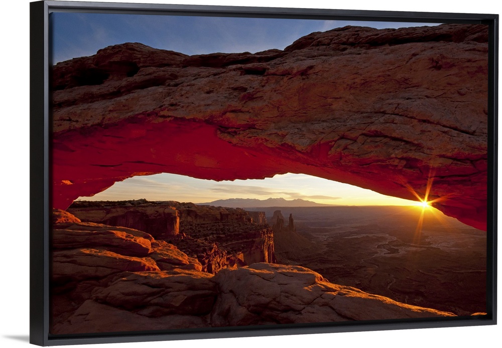 <p>A photograph is taken through the mesa arch as the sun begins to rise over the horizon.</p>