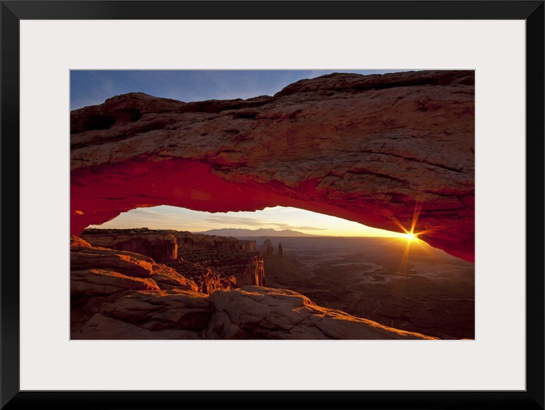 <p>A photograph is taken through the mesa arch as the sun begins to rise over the horizon.</p>