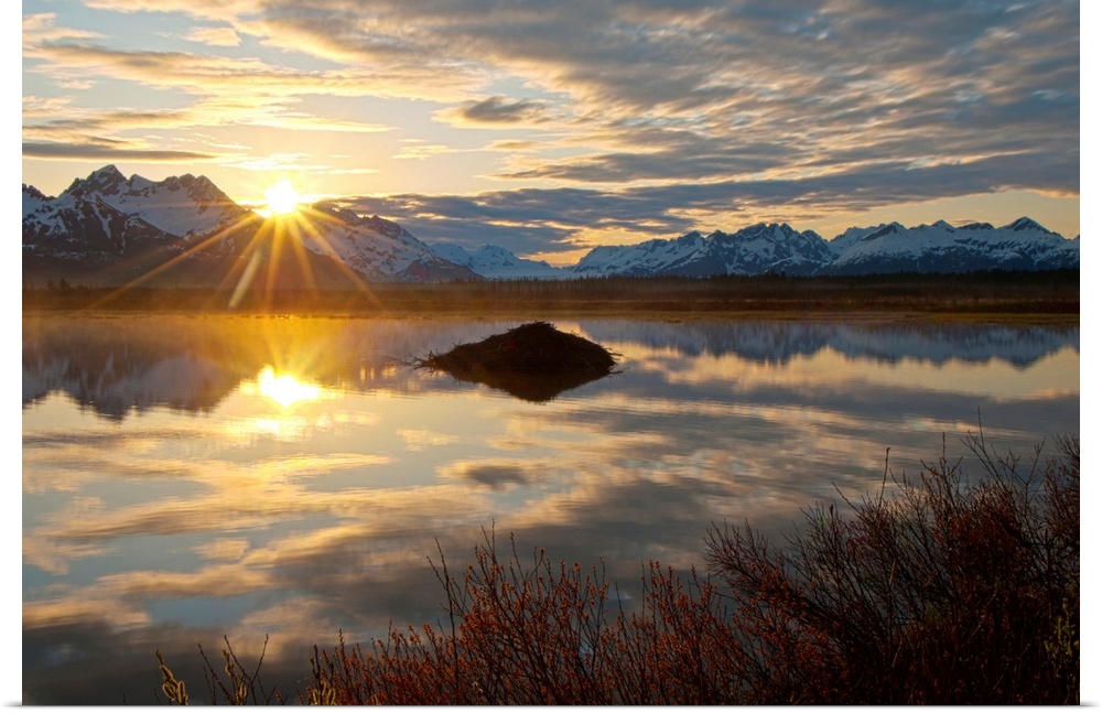 <p>Sun rises over the Chugach Mountains at a pond with a beaver lodge along the Copper River Highway in the Chugach National Forest.</p>