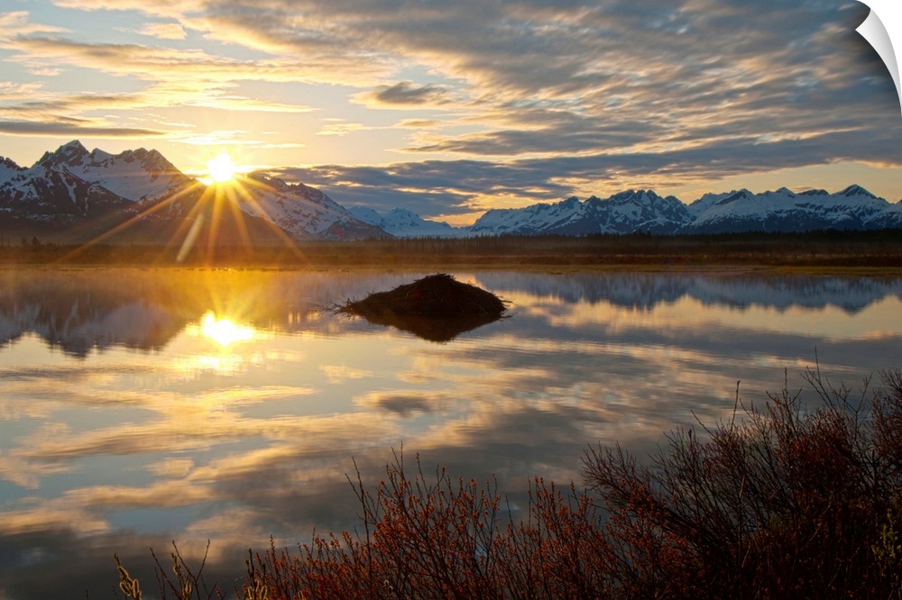 <p>Sun rises over the Chugach Mountains at a pond with a beaver lodge along the Copper River Highway in the Chugach National Forest.</p>