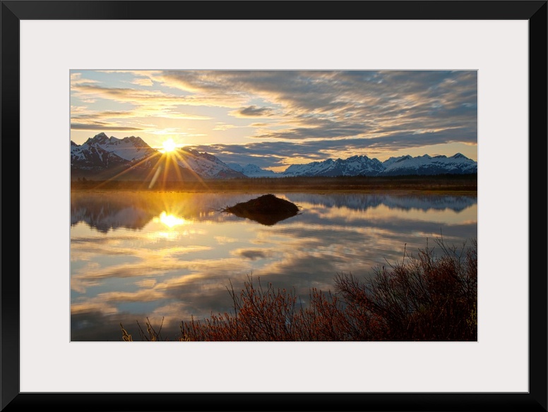 <p>Sun rises over the Chugach Mountains at a pond with a beaver lodge along the Copper River Highway in the Chugach National Forest.</p>