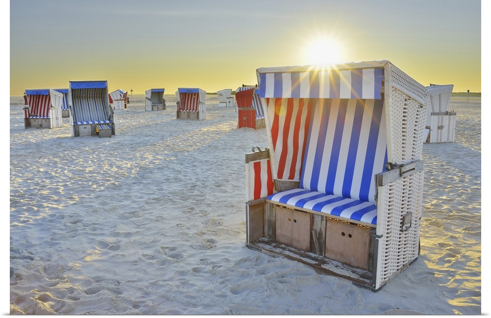 <p>Sun Rising over Beach Chairs at Beach, Norderdeich, Sankt Peter-Ording, North Sea, Schleswig-Holstein, Germany</p>