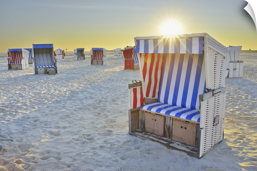 <p>Sun Rising over Beach Chairs at Beach, Norderdeich, Sankt Peter-Ording, North Sea, Schleswig-Holstein, Germany</p>