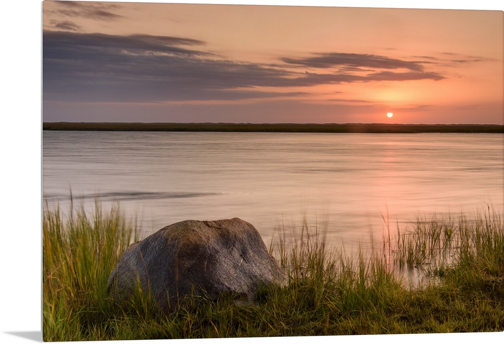 <p>Landscape photograph of a warm sunset over water with a rock in the foreground.</p>