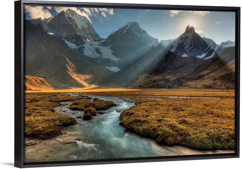 <p>Sun sets behind Jirishanca, Yerupaja on left, river flows into Carhuacocha lake, Cordillera Huayhuash, Andes mountains, northern Peru</p>