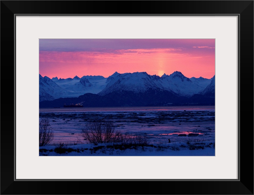 <p>Photo print of rocky mountains with the sun setting behind them.</p>