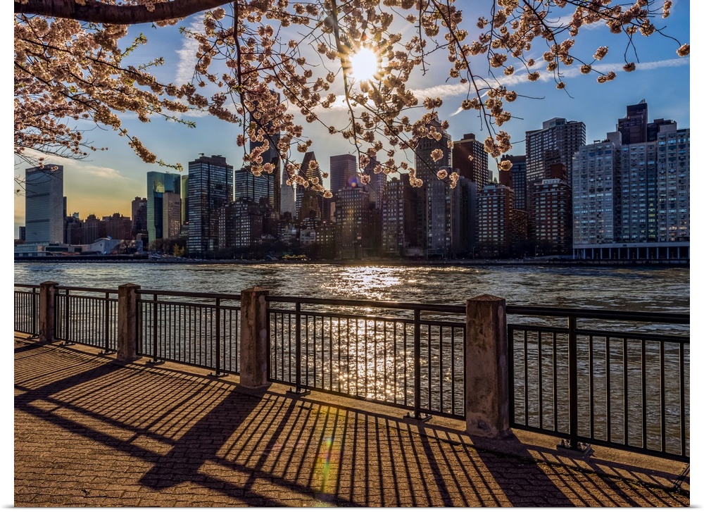<p>Sun setting behind cherry blossoms (Kwanzan Prunus serrulata) with a view of the Manhattan skyline, viewed from Roosevelt Island; New York, United States of America</p>
