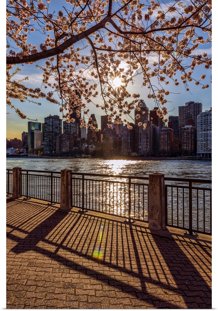 <p>Sun setting behind cherry blossoms (Kwanzan Prunus serrulata) with a view of the Manhattan skyline, viewed from Roosevelt Island; New York, United States of America</p>