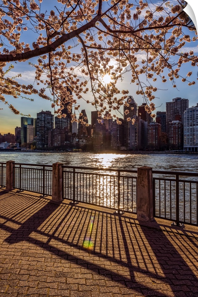 <p>Sun setting behind cherry blossoms (Kwanzan Prunus serrulata) with a view of the Manhattan skyline, viewed from Roosevelt Island; New York, United States of America</p>