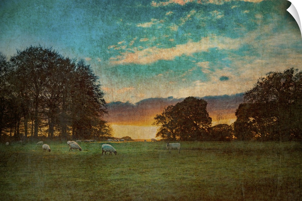<p>Rural countride view across agricultural land at dusk in East Sussex, England with sheep grazing in a field at dusk.</p>