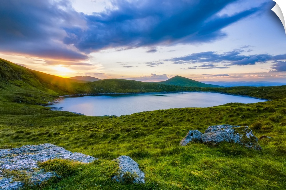 <p>Sun setting over Lough Muskery in the Galty Mountains in summer with large boulders in the foreground, Galty Mountains; County Limerick, Ireland.</p>