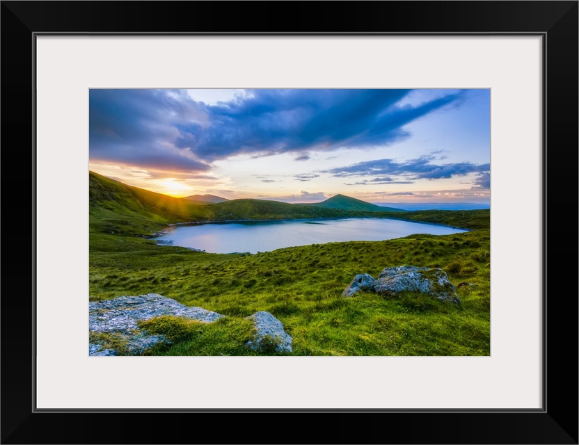 <p>Sun setting over Lough Muskery in the Galty Mountains in summer with large boulders in the foreground, Galty Mountains; County Limerick, Ireland.</p>