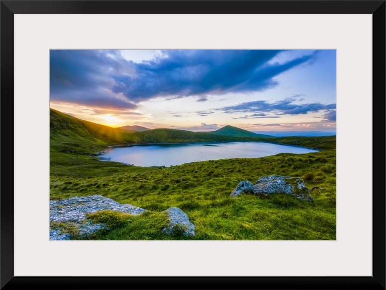 <p>Sun setting over Lough Muskery in the Galty Mountains in summer with large boulders in the foreground, Galty Mountains; County Limerick, Ireland.</p>