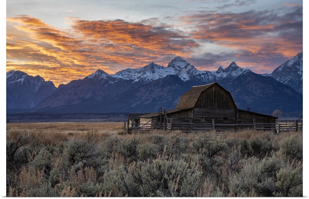 <p>Sun setting over the Teton Range at Moulton Barn, Grand Teton National Park, Wyoming, United States of America, North America</p>