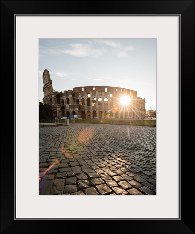 <p>Photograph of the sun shining right though the middle of the Colosseum.</p>