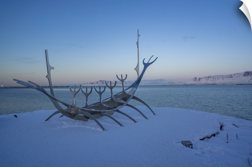 <p>View of the Sun Voyager sculpture at dusk in the city centre in winter, Reykjavik, Iceland</p>