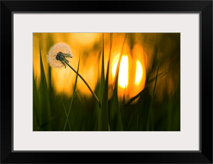 <p>A dandelion flower full of seeds sways in the wind, with the setting sun in the distance.</p>
