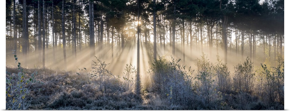 <p>Sunbeams shine through trees to a frosty ground; Surrey, England.</p>