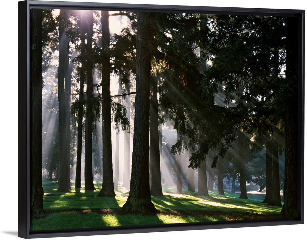 <p>Light shining through tree trunks in a park in North West America in this landscape photograph.</p>
