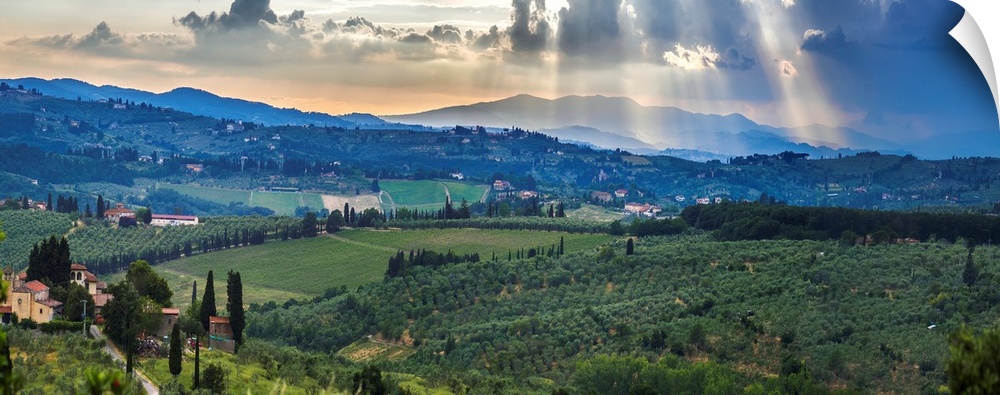 <p>Sunbeams through the clouds over vineyards. Capanuccia, Florence, Italy.</p>