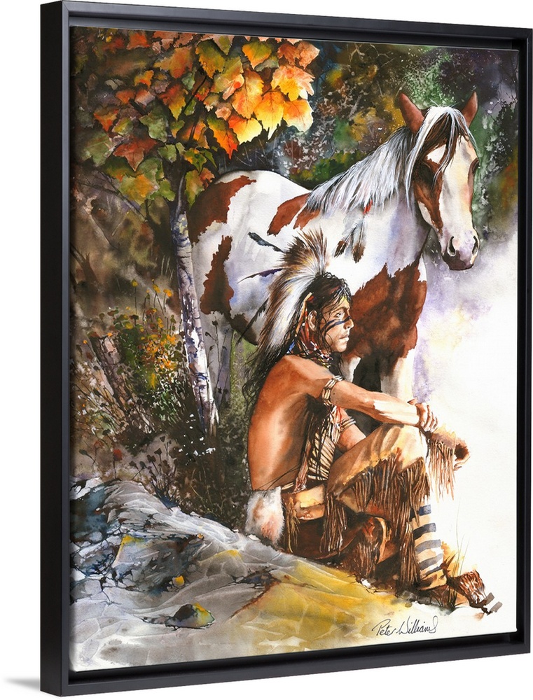 <p>A native American Indian looks out at the rising sun, the warm mornings sun rays wash over him and his pony.</p>