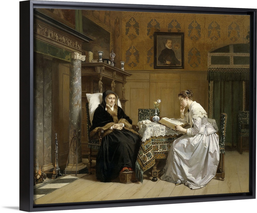 <p>Sunday Morning, by Hendrik Jacobus Scholten, c. 1865-68, Dutch, oil paint on panel. In a prosperous 17th century interior, a silk clad young woman reads a Bible to an old woman in fur trimmed black clothing. A portrait of a man hangs on wall.</p>