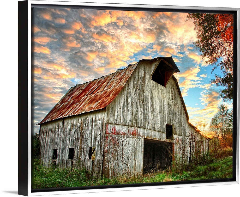<p>Sunset over an old, weathered barn, with a cloudy sky.</p>