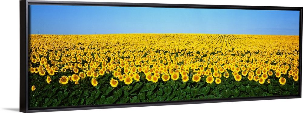 <p>A panoramic photograph of a large sunflower field in North Dakota with blue sky on top.</p>