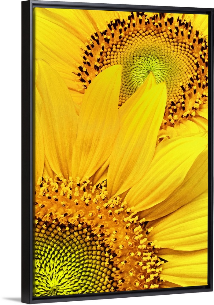 <p>Two sunflower heads in full bloom with wide, golden petals, with views of the small disk flowers in fractal formation in the center.</p>