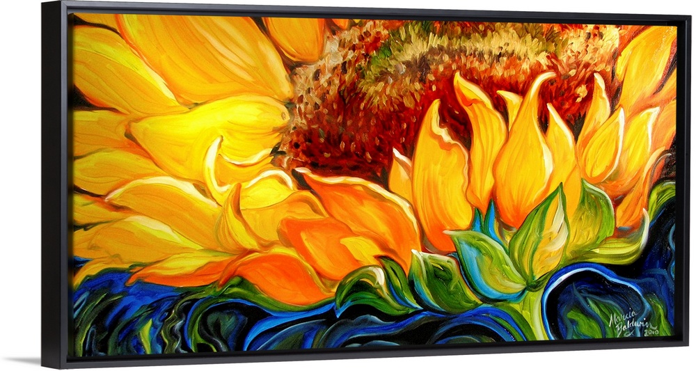 <p>Wide painting of a sunflower close up with an abstract blue, black, and green background.</p>