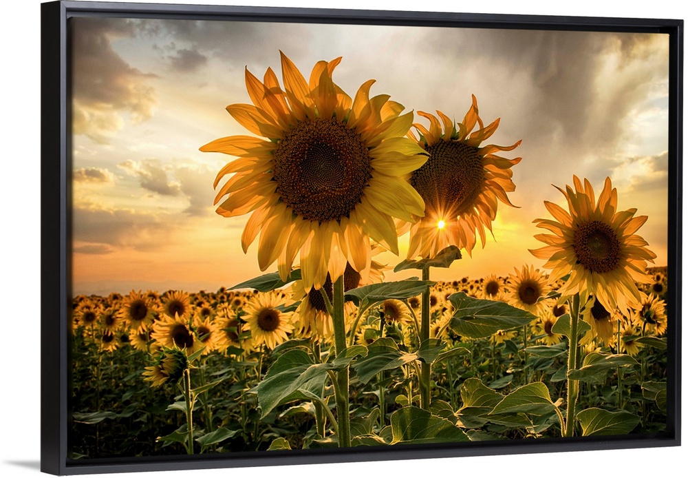 <p>Sunflower field at sunset with a beautiful sun starburst.</p>