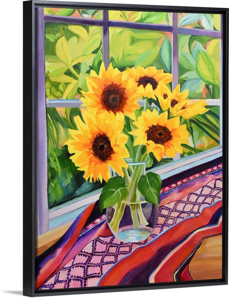 <p>Sunflowers in glass vase on table with plants visible through window.</p>