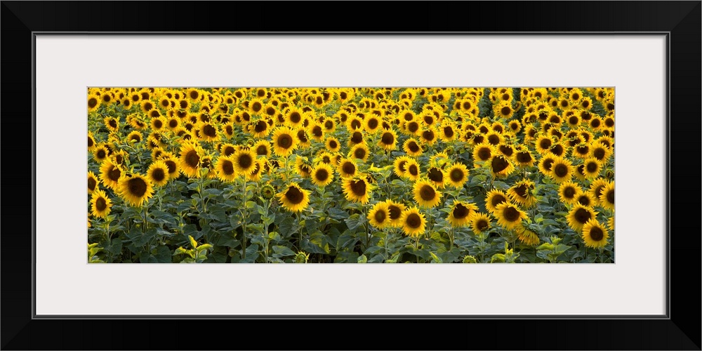 <p>Panoramic photograph on a big wall hanging of a dense field of vibrant sunflowers in Bouches-Du-Rhone, Provence, France.</p>