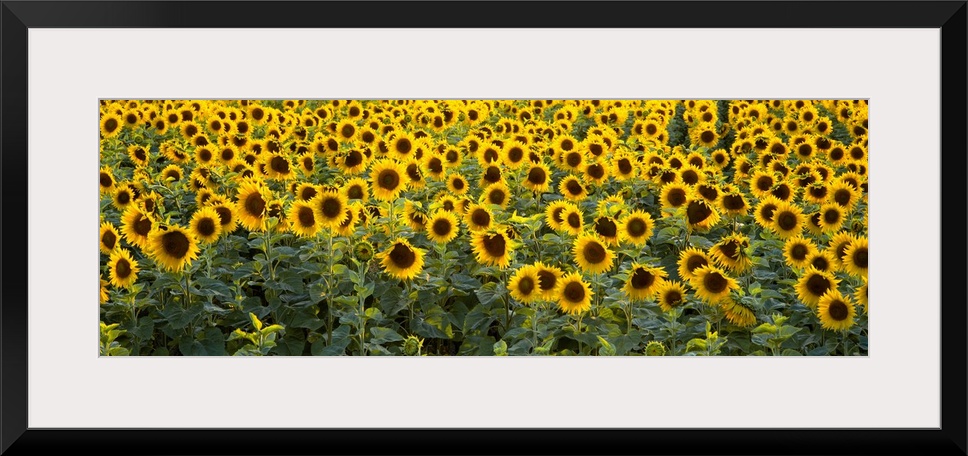 <p>Panoramic photograph on a big wall hanging of a dense field of vibrant sunflowers in Bouches-Du-Rhone, Provence, France.</p>