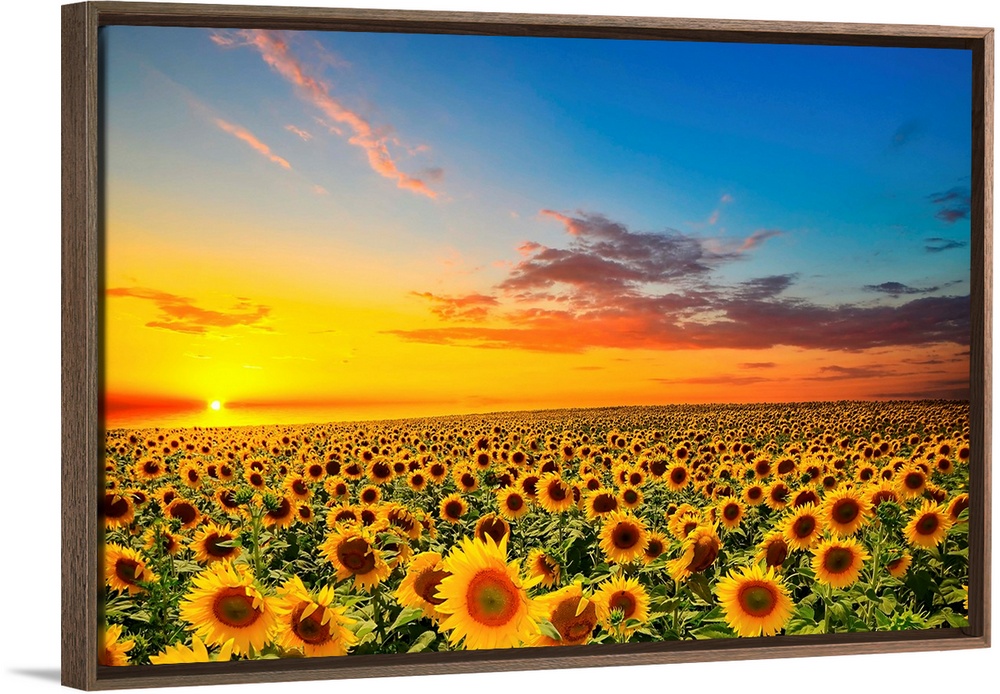 <p>Field of blooming sunflowers at sunset.</p>
