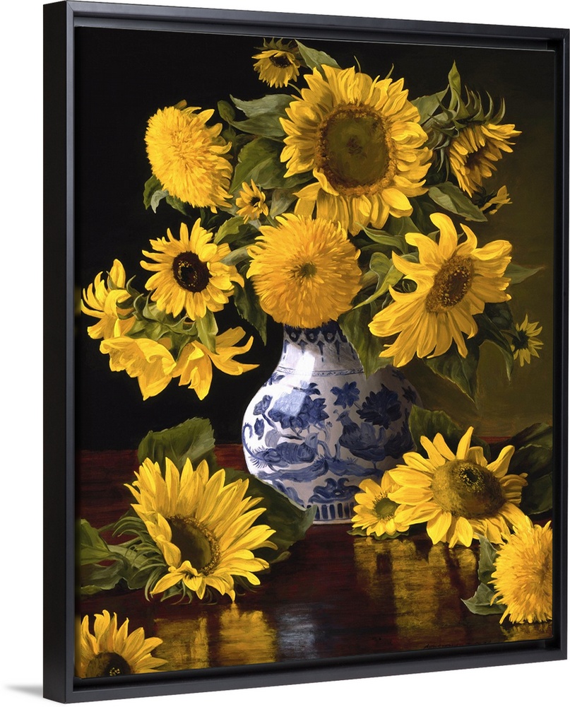 <p>Contemporary still-life painting of big yellow sunflowers in a Chinese vase.</p>