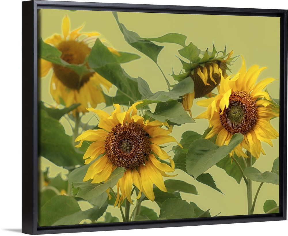 <p>Large sunflowers whose petals have begun to wilt are photographed in front of a light green background.</p>
