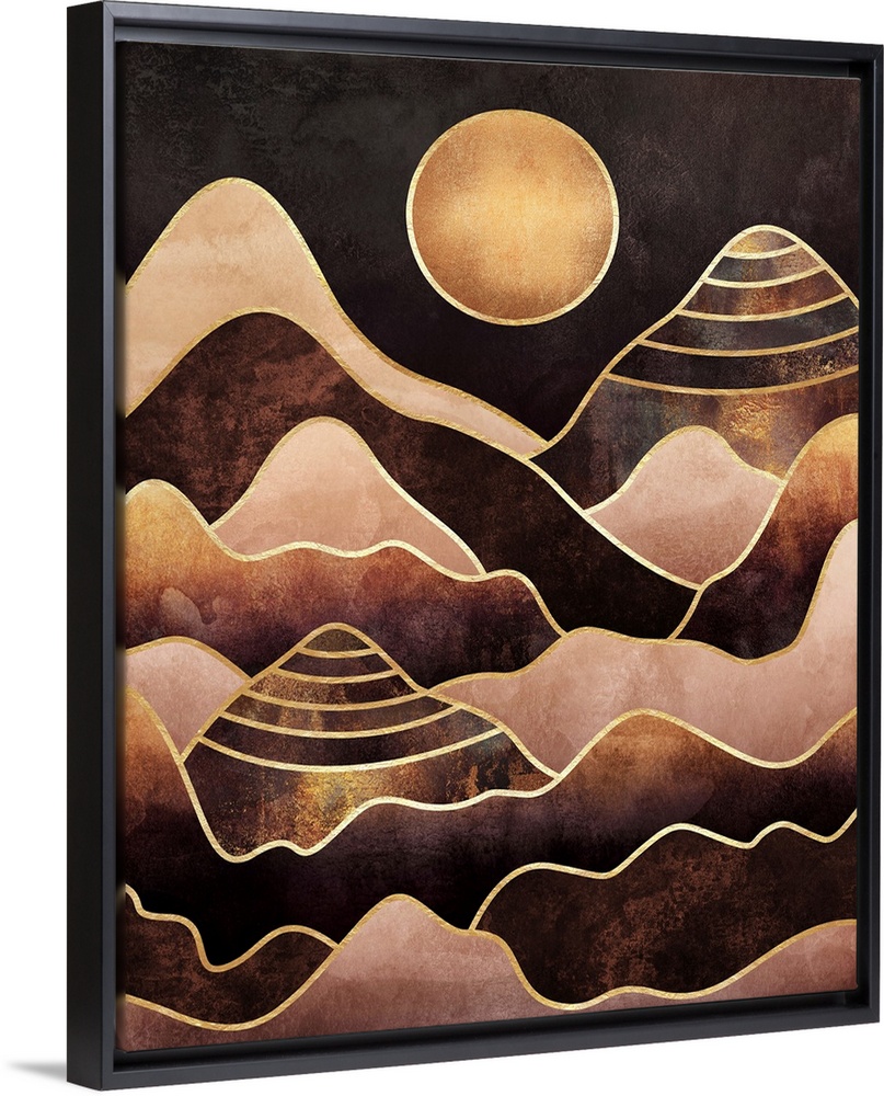 <p>Overlapping, organic trianglular shapes in shades of rose gold and brown outlined in gold, representing a series of mountains under a dark brown sky with a golden sun.</p>
