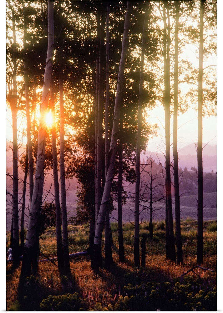 <p>Sunlight filters through a forest of aspen trees in autumn in Yellowstone National Park at sunset, Wyoming, United States of America</p>