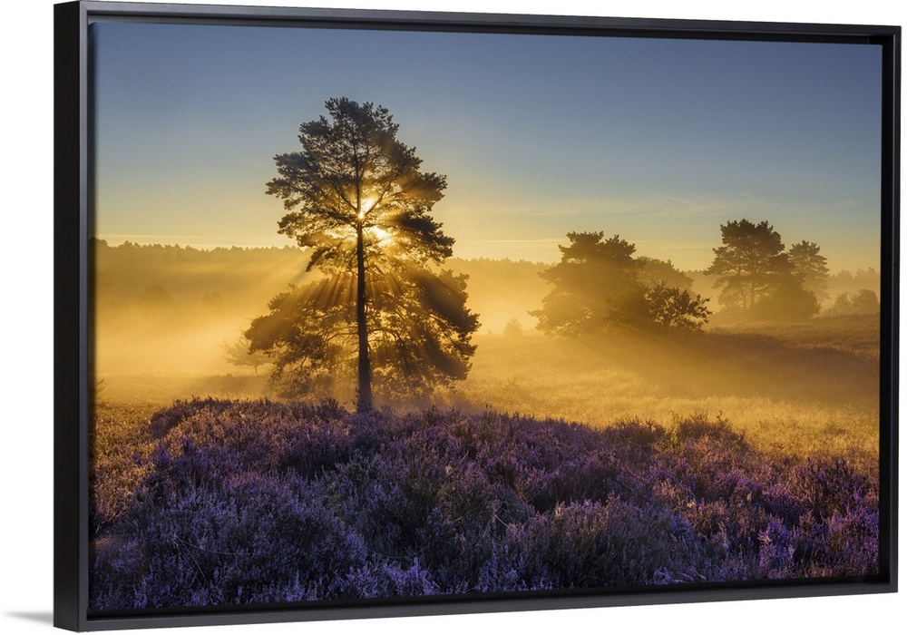 <p>Sunlight-flooded tree in blooming heathland (Calluna vulgaris) in the Lueneburg Heath in Lower Saxony, Germany.</p>