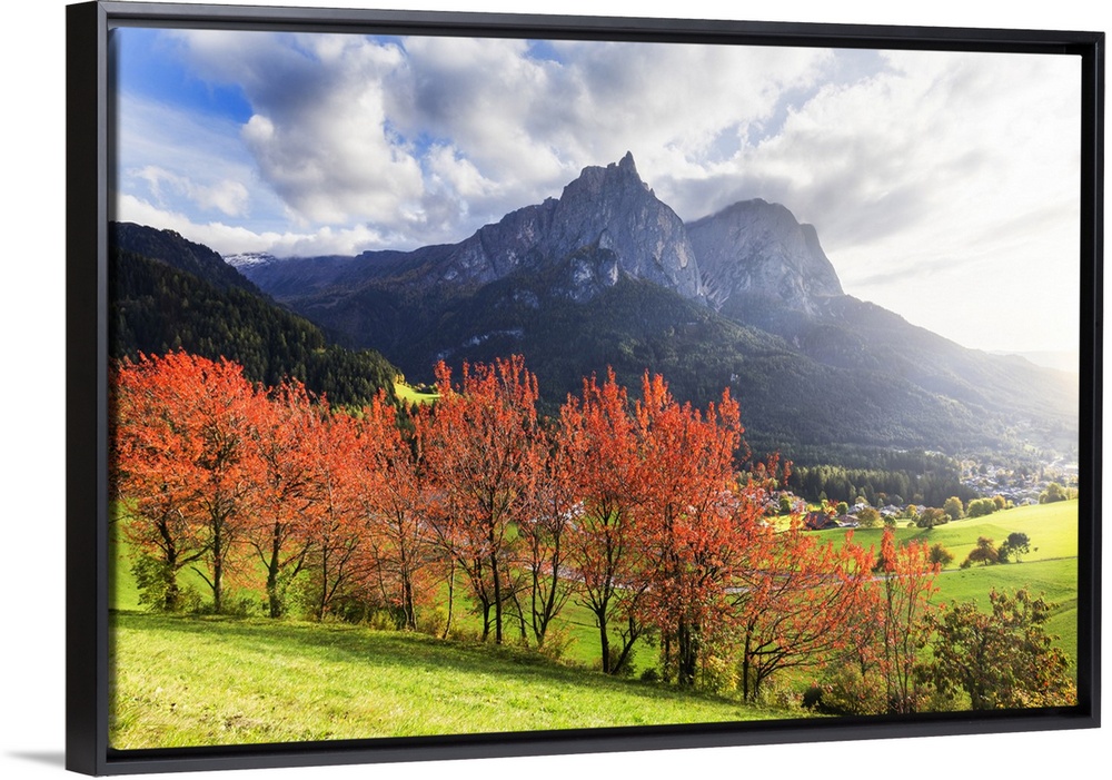 <p>Sunlight illuminates red leafs of cherry trees. Siusi allo Sciliar, Dolomites, province of Bolzano, South Tirol, Italy, Europe.</p>