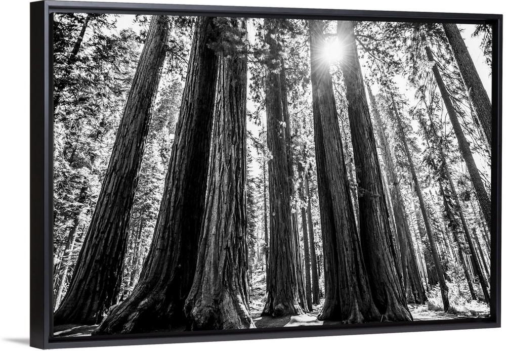<p>View of the sunlight peeking through giant Sequoia trees in California.</p>