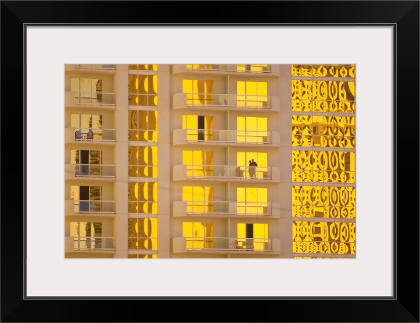 <p>Sunlight reflects bright gold on high rise casino windows.</p>