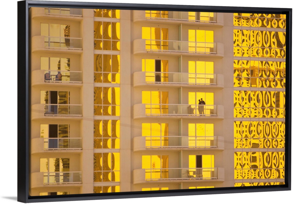 <p>Sunlight reflects bright gold on high rise casino windows.</p>