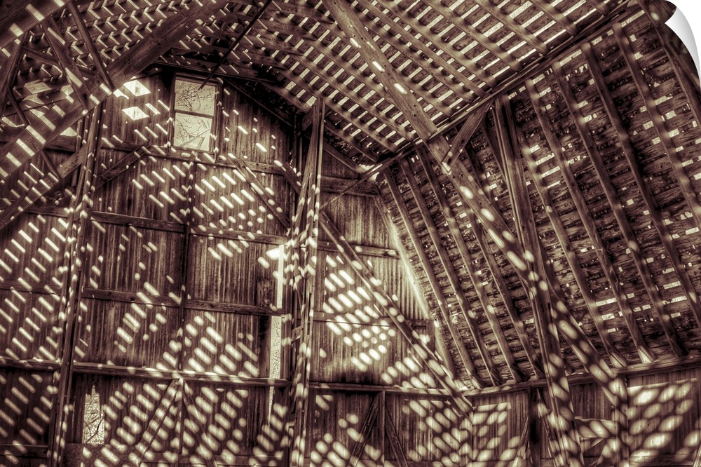 <p>Sunlight shinig through timbers in an old farm building</p>