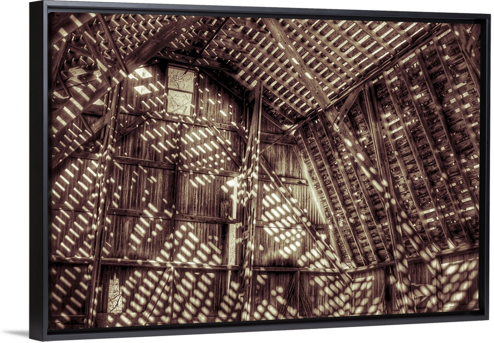 <p>Sunlight shinig through timbers in an old farm building</p>