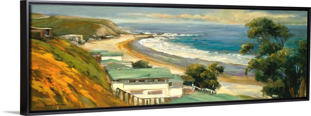 <p>Fine art oil painting seascape of a sunlit California cove dotted with beach homes nestled up to the golden hills by Allayn Stevens.</p>