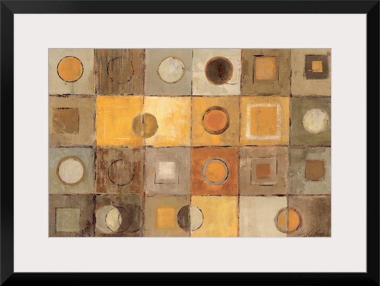 <p>Large artwork that has twenty four small squares throughout the print that than has smaller squares and circles inside them.</p>