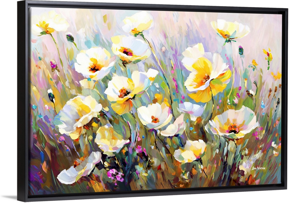 <p>This contemporary floral landscape bursts with the delicate white and yellow hues of poppies, nestled amongst a vivid array of wildflowers. Together, they evoke the untamed beauty of a meadow in full bloom, creating an exquisite piece that would complement any living room.</p>
