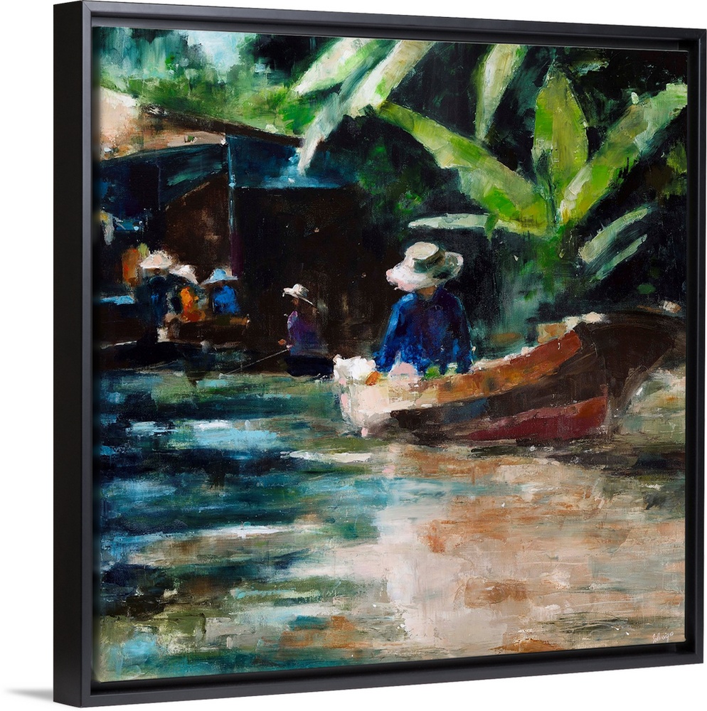 <p>Contemporary painting of a person in a boat on a river.</p>